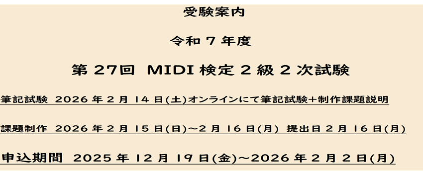 下記より「MIDI検定2級2次試験」のご案内」をご覧下さい。